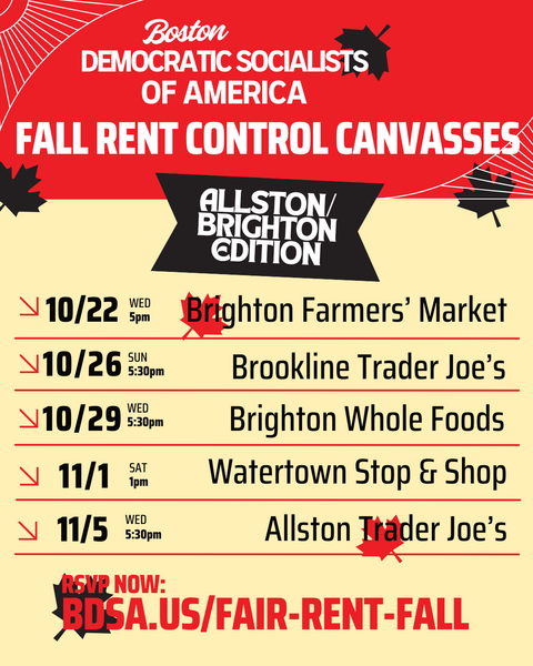 Join Allston/Brighton DSA members to canvass for DSA's rent control campaign! We are just weeks away from the deadline for organizers across the state to collect 75,000 signatures- help win housing affordability in Massachusetts by canvassing with us!