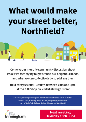 The Northfield constituency sub group of Better Streets for Birmingham. We want to see an Allens Cross, Frankley, Kings Norton, Longbridge, Northfield, Rednal, Rubery and Weoley Castle where everyone can gets home safely and has options to leave the car at home.