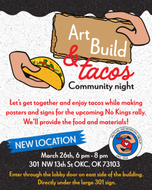 Join the OKC DSA Mutual Aid Working Group on the 4th or 5th Thursday of each month for a community meal and collaboration on mutual aid projects in the area. Entrees are provided, but attendees are encouraged to bring sides, desserts, and/or beverages. Non-DSA members, Friends of DSA, and people completely new to organizing are all welcome. Our goal is to promote regular meet-ups of Oklahomans who are interested in making the world a better place through mutual aid and socialism.