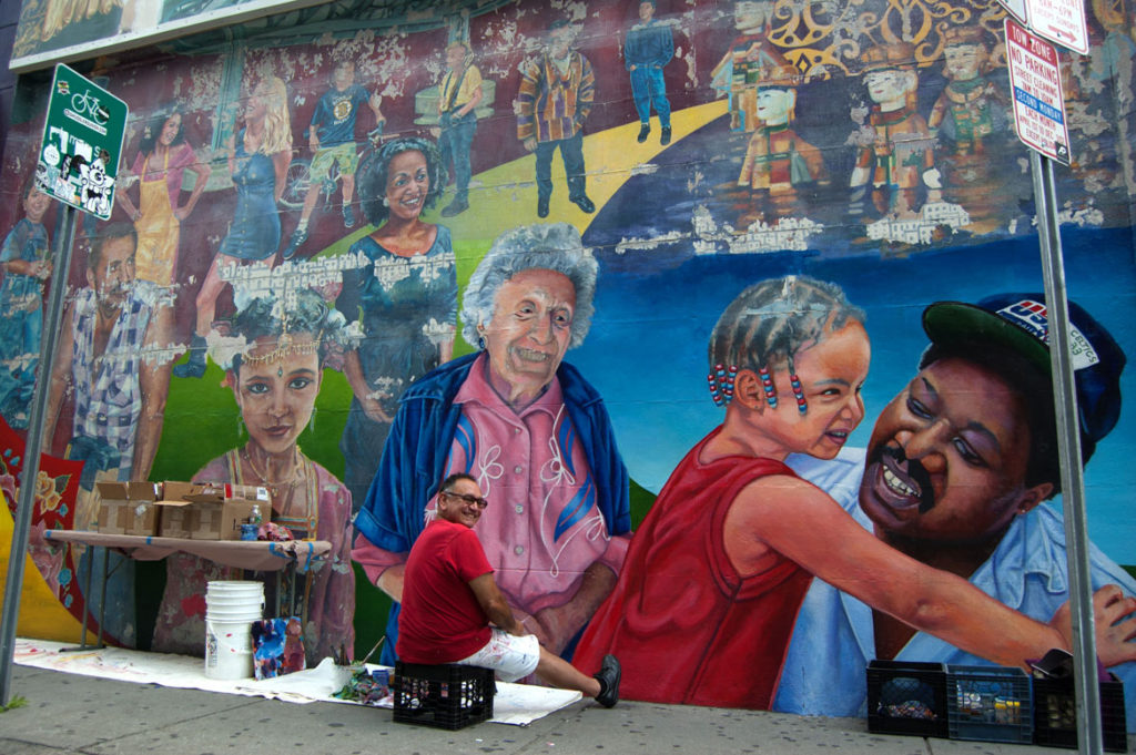 California artist Daniel Galvez restores and repaints his iconic mural “Crosswinds” on the side of the Middle East Restaurant and Nightclub in Cambridge, Aug. 10, 2017. (Greg Cook/Cambridge Arts Council)
