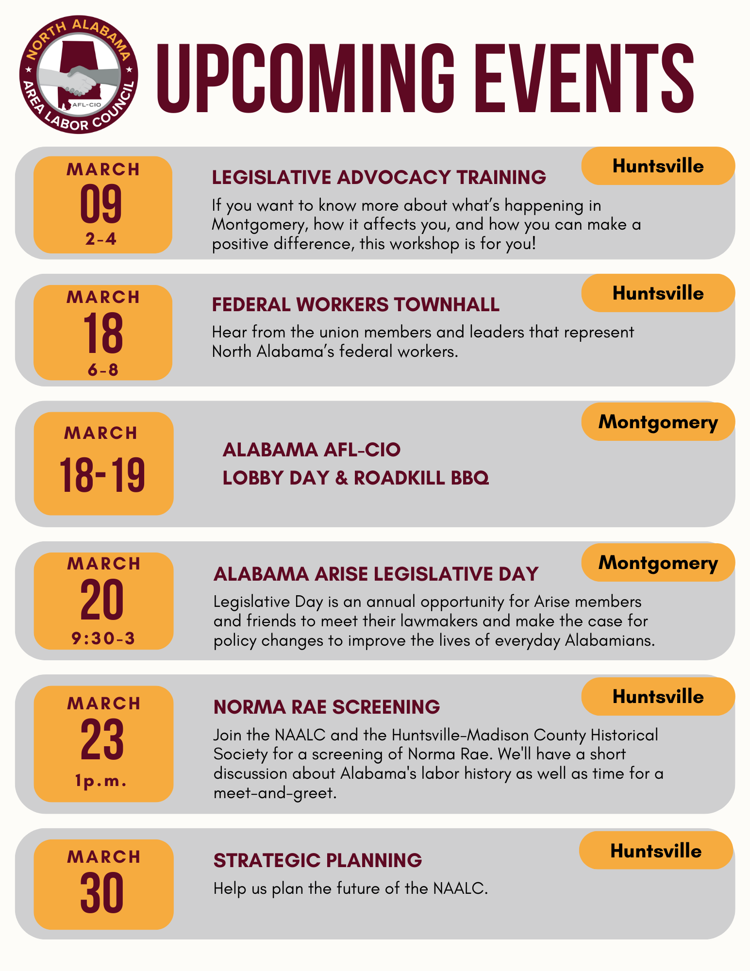 - Legislative Advocacy Training with Alabama Arise: Sunday, March 9, 2 p.m.-4 p.m. at NALC Branch 462, 1201 Posey St. NW, Huntsville, AL 35816