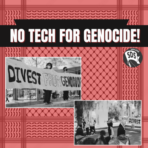 No Tech for Genocide is a 56-year-old demand of the historic Students for a Democratic Society at San Jose State, during the Vietnam War. The University must take the following actions to remove itself from genocide, White supremacy, and militarism, or the agitated campus community will take appropriate and direct action to have our demands met.