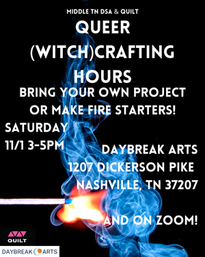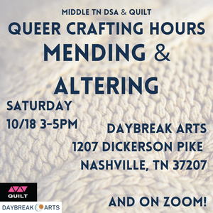 Join Middle TN DSA and QUILT for Queer Crafting Hours! Every other Saturday, we'll meet to learn a new skill, find joy in creative labor, enjoy time with comrades, and strengthen our community.