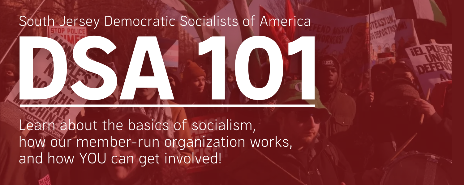 Interested in learning more about your local DSA chapter? Join us for a DSA 101 where we'll talk about the basics of socialism, how our member-run organization works, and how YOU can get more involved!