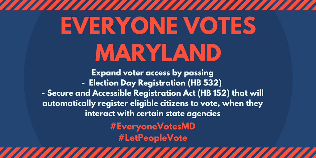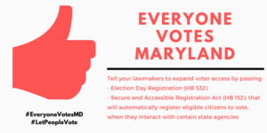 Choose an action to the right! Email and call you legislators and let them know you support expanding voter access to make it as simple as possible so that every eligible Marylander can vote!