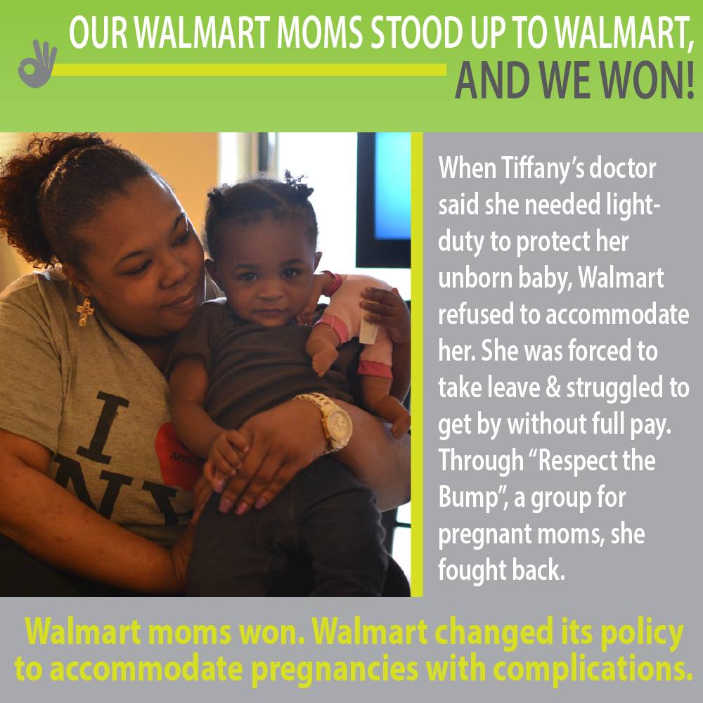 Walmart moms won a major policy victory when Walmart agreed to change their pregnancy policy to ensure that women with pregnancy-related complications are given basic ac-commodations that will help them keep their jobs and provide for their families. That means potentially over 700,000 women will no longer have to choose between keeping their jobs and protecting their health