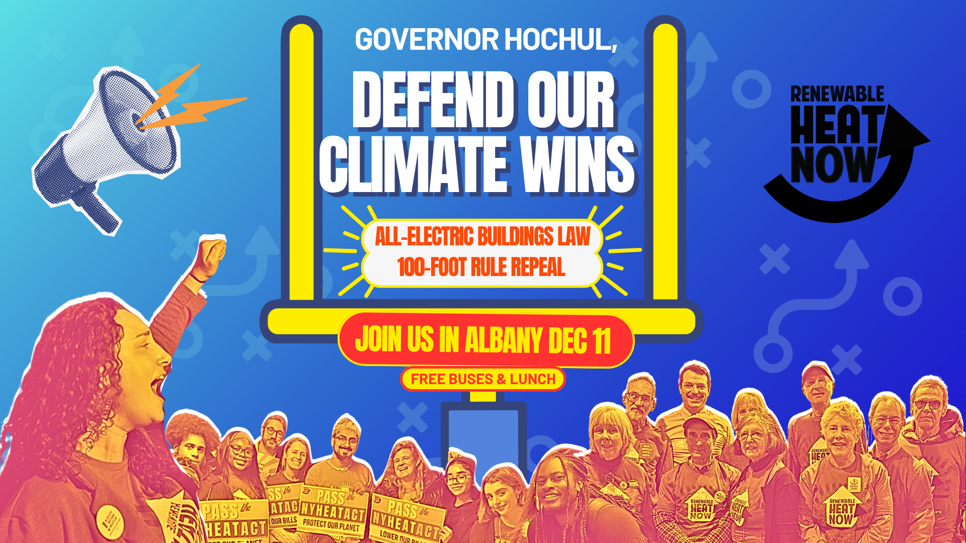 We’re gathering in Albany to call on Governor Hochul to stop gas infrastructure expansion in NY by signing the 100-Foot Rule Repeal, the first pillar of the NY HEAT Act (more info below) and implementing the All-Electric Buildings Act in 2026.