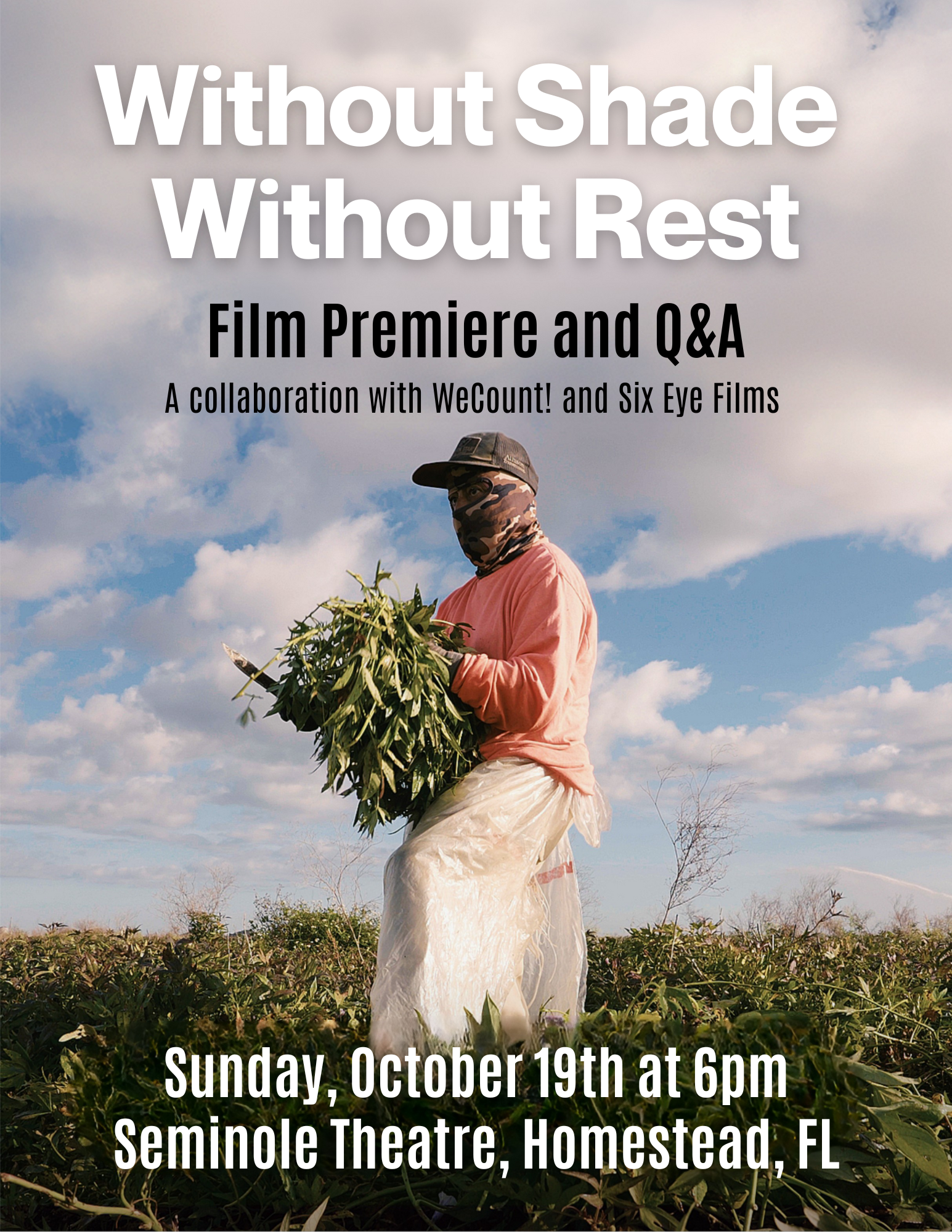 Join WeCount! and Six Eye Films for the South Florida premiere of Without Shade, Without Rest a new short film that features two organizations, WeCount! and the Coalition of Immokalee Workers, and their worker-led struggles to win life-saving heat protections in Florida. We'll be gathering at 6:00pm at the historic Seminole Theatre in Homestead, Florida, and will host a brief Q&A with WeCount! worker leaders and the filmmakers of Six Eye Films afterwards. All are welcome! For more information, visit sixeyefilms.org/withoutshadewithoutrest.