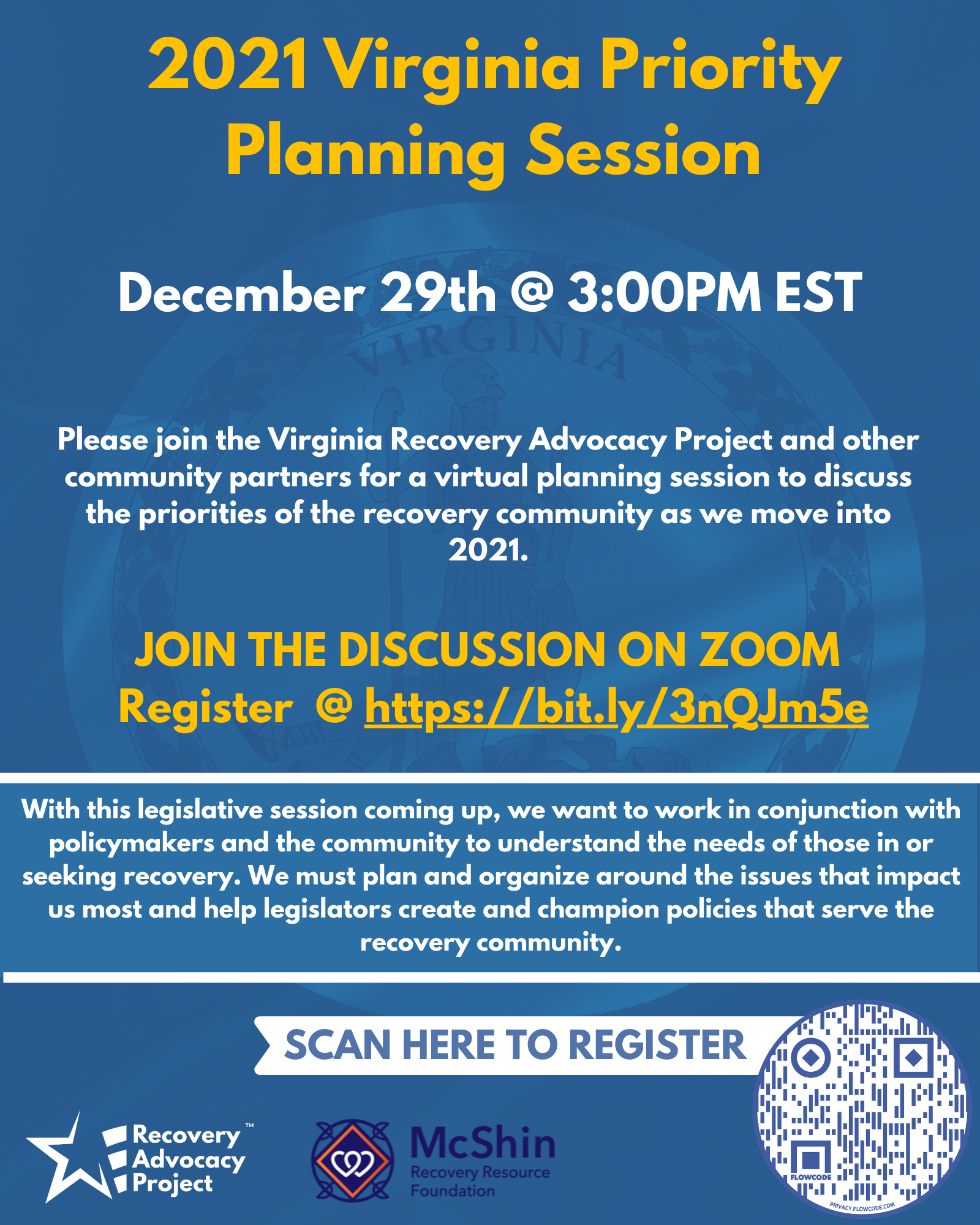 Please join the Virginia Recovery Advocacy Project and other community partners for a virtual conversation to discuss and plan the recovery communities priorities this upcoming year.