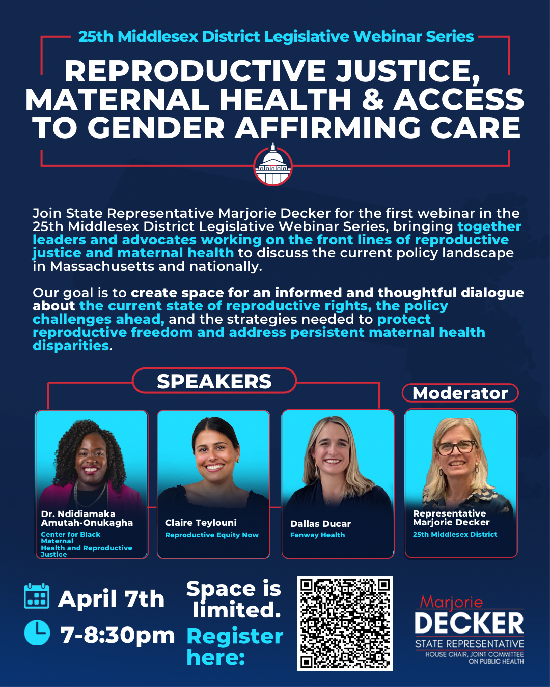 Join State Representative Marjorie Decker for the first webinar in the 25th Middlesex District Legislative Webinar Series, bringing together leaders and advocates working on the front lines of reproductive justice and maternal health to discuss the current policy landscape in Massachusetts and nationally.