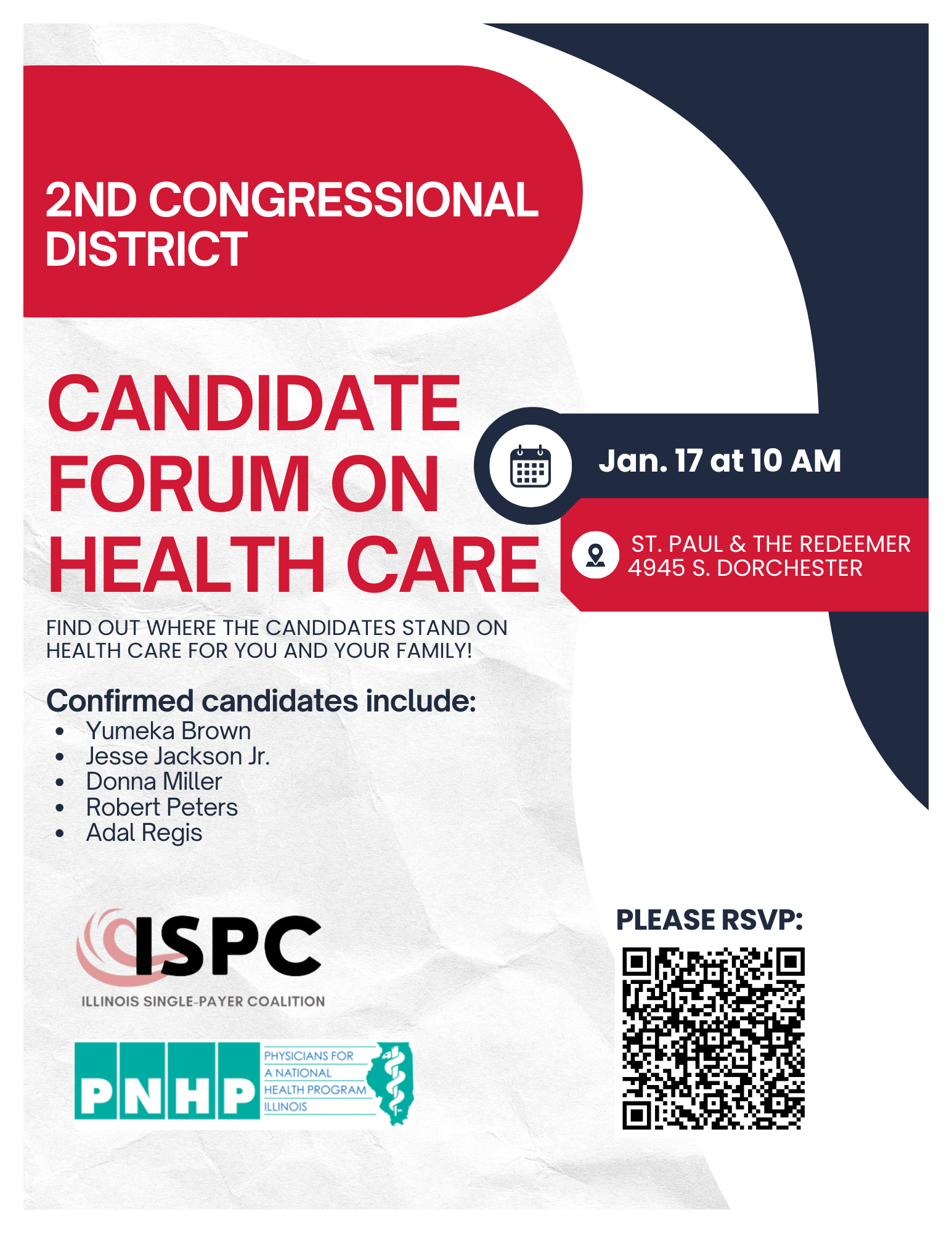 The Illinois Single Payer Coalition and the Illinois Chapter of Physicians for a National Health Plan are hosting a very timely Health Care Candidate Forum in the 2nd Congressional District on Saturday January 17th at 10 A.M. at St. Paul & the Redeemer at 4945 S. Dorchester in Hyde Park.