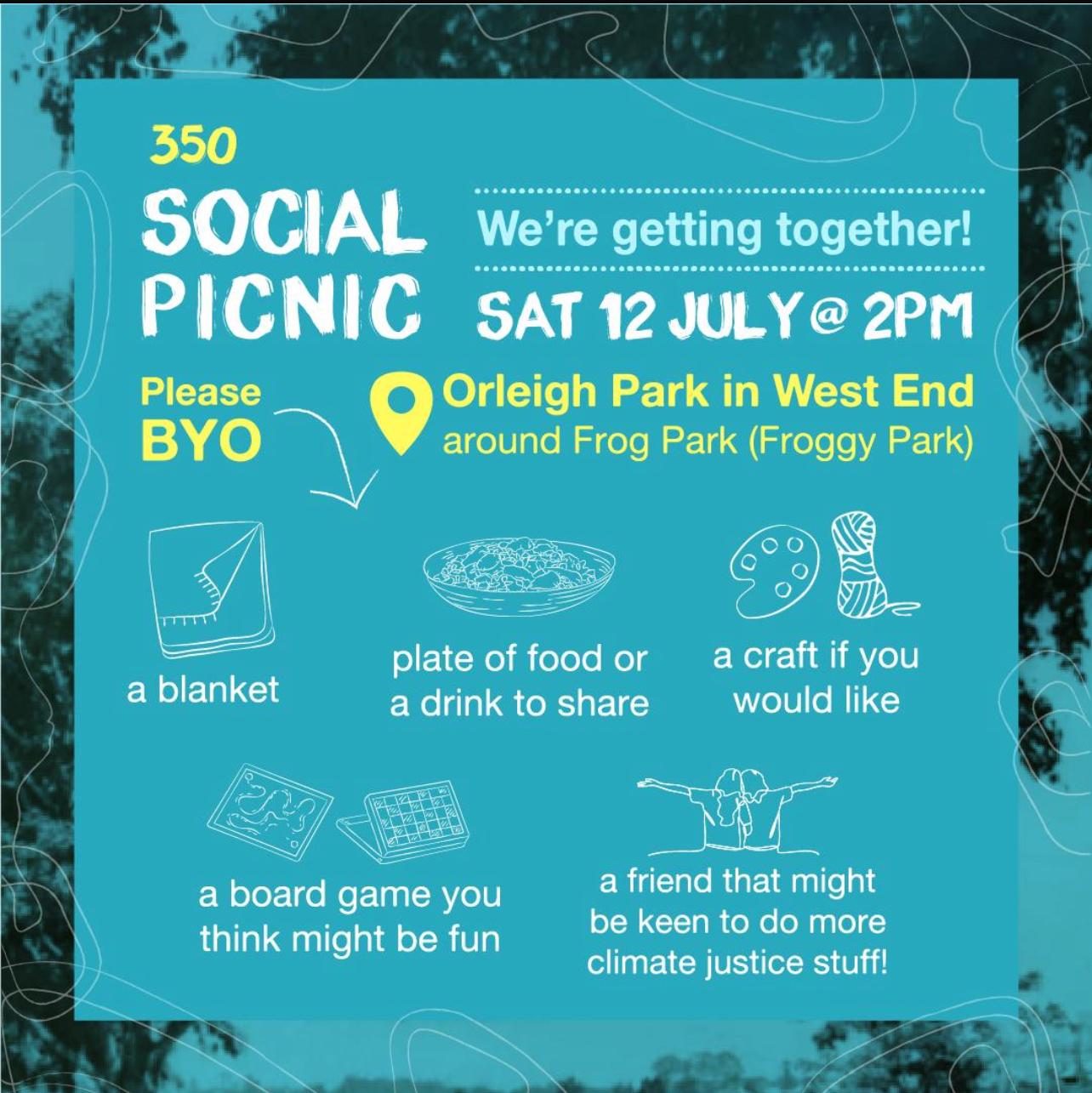 Come along to the 350 Magan-Djin Winter Picnic Saturday 12 July at 2:00PM in Orleigh Park (Near the Frog Park)! Join us as we lay in the sun, share food, laugh and soak up the winter sunshine next to the beautiful Maiwar (brisbane river).