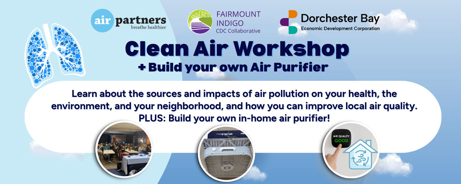 Join the Fairmount Indigo CDC Collaborative, Air Partners, and Dorchester Bay EDC for an engaging, hands-on community workshop where we will explore the importance of clean air and its impact on our health and well-being. Together, we’ll learn simple, affordable ways to improve air quality at home, and each attendee will get to build their very own air purifier.