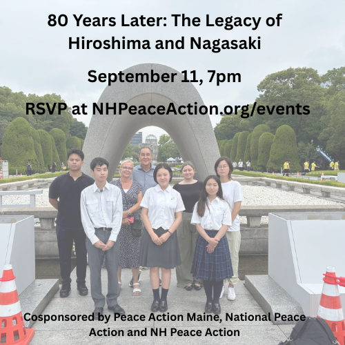 Lilly Dragnev has just returned from the International Peace Conference in Japan --- where she was hosted by the Japan Congress Against A and H-Bombs (GENSUIKIN) --- and will share her experiences with us. Peace Action, formed in 1957, emerged from the Sane/Freeze movement and maintains its focus on nuclear policy and nuclear weapons. It is a participating NGO at recent TPNW UN events and has regularly been represented at the International Peace Conference in Japan over the years. GENSUIKIN was established in 1965, and it is one of the largest anti-nuclear and peace organizations in Japan. GENSUIKIN has local organizations as members, consisting of labor unions, women’s organizations, youth organizations and civil society groups in all 47 prefectures of Japan. Eight decades after the bombings of Hiroshima and Nagasaki, Lilly and those at the International Peace Conference worked to continue the stalled efforts for nuclear weapons abolition. Join us this Thursday to ask her your questions.