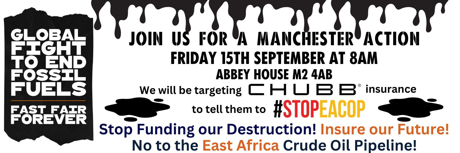 Join us in Manchester for an action against Chubb insurance demanding they commit not to insurance the East Africa Crude Oil Pipeline! We will be outside their Manchester office from 8am on Friday 15th September with placards and leaflets.