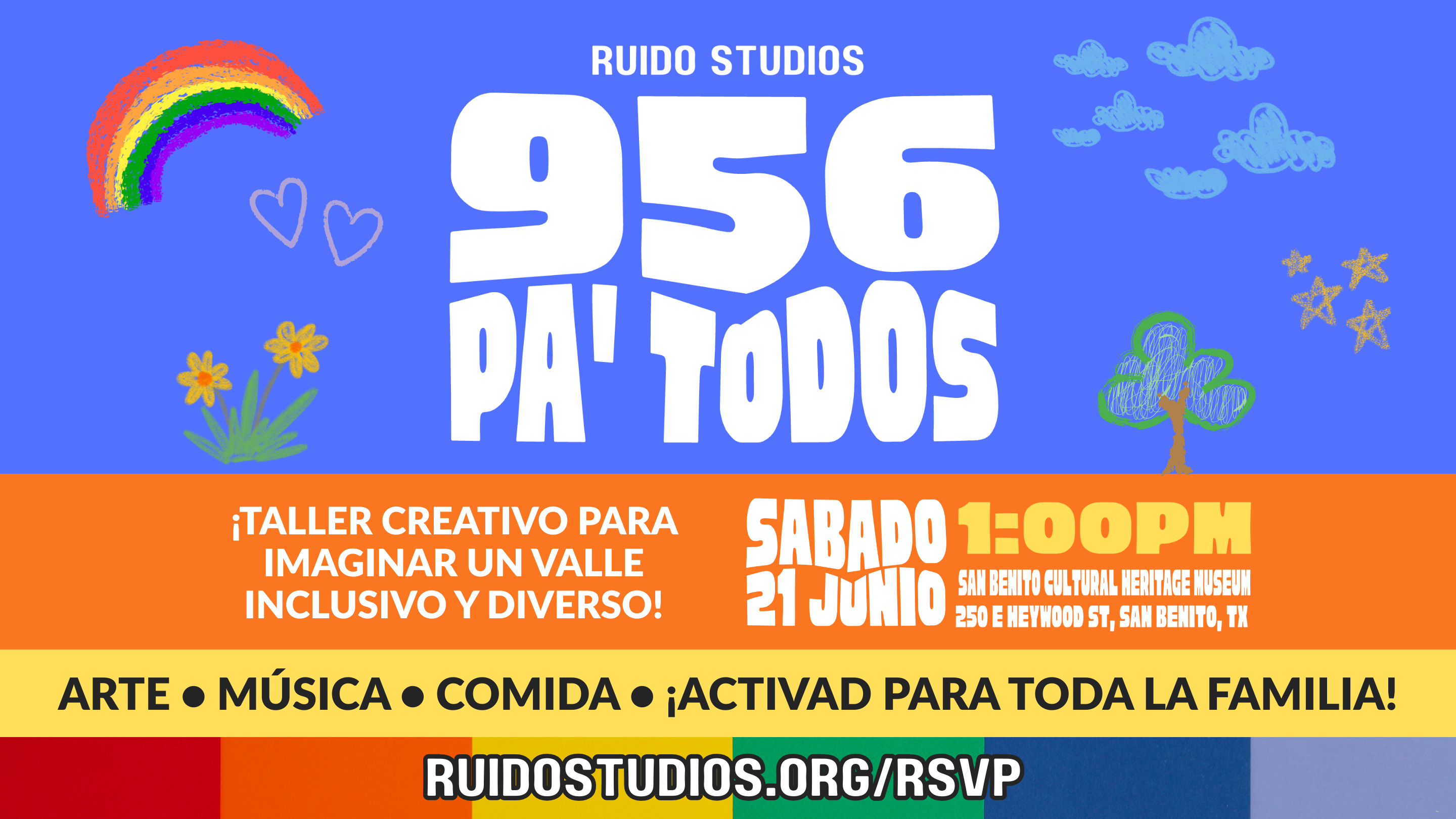 English: Join Ruido Studios and the San Benito Cultural Heritage Museum for a creative workshop to imagine an inclusive and diverse future for the RGV. Let’s tell a new story where everyone— no matter our race, genders, background, or faiths— can thrive in the RGV! This is a family friendly event. During this event we will share a short presentation, followed by a guided interactive activity and lunch.