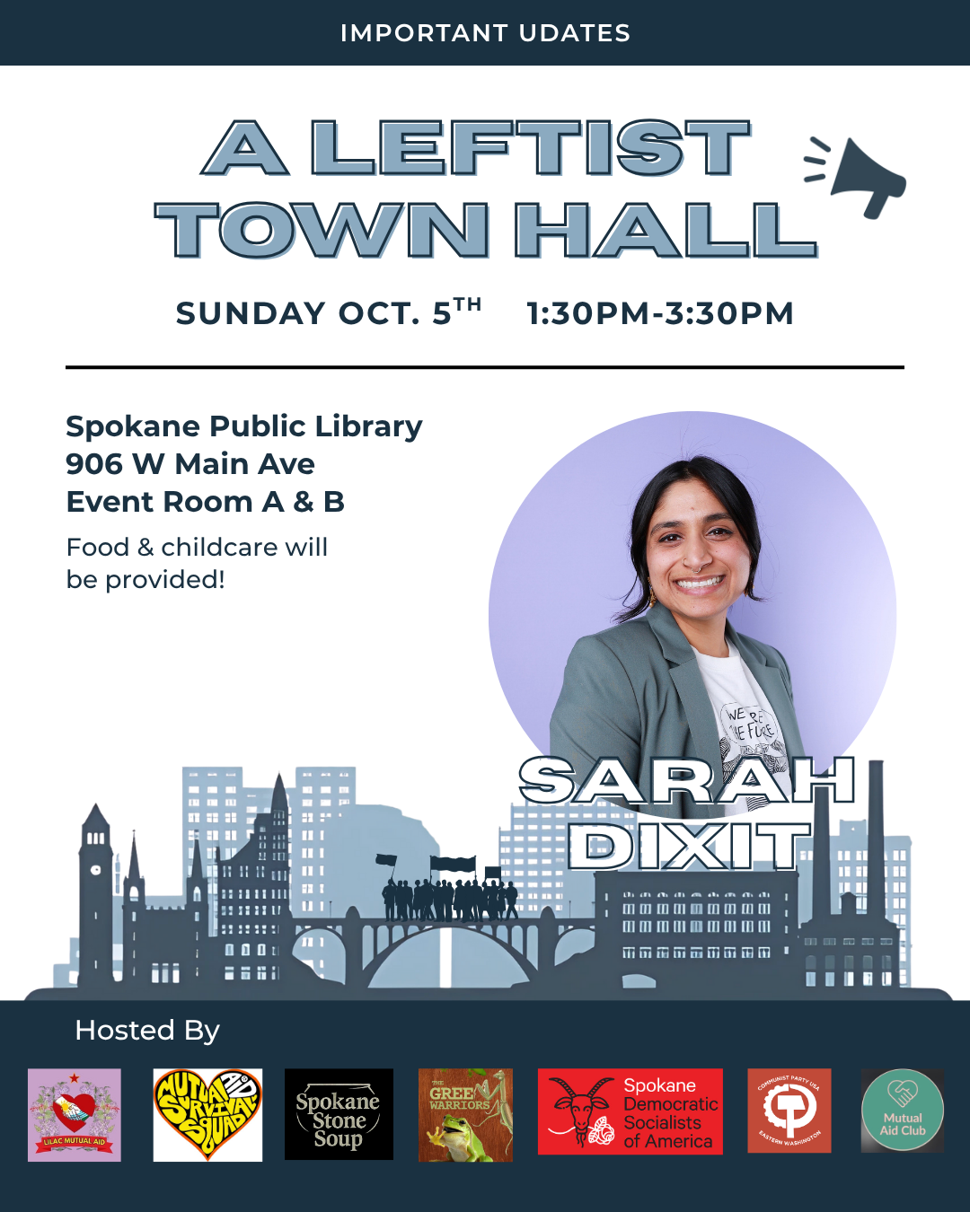 Join us for a first-of-its-kind event in Spokane: a town hall created by and for Spokane’s anticapitalist left. This is our chance to ask the questions that matter to us - and hear directly from some of Spokane’s most progressive candidates about the issues facing everyday people and the working class.