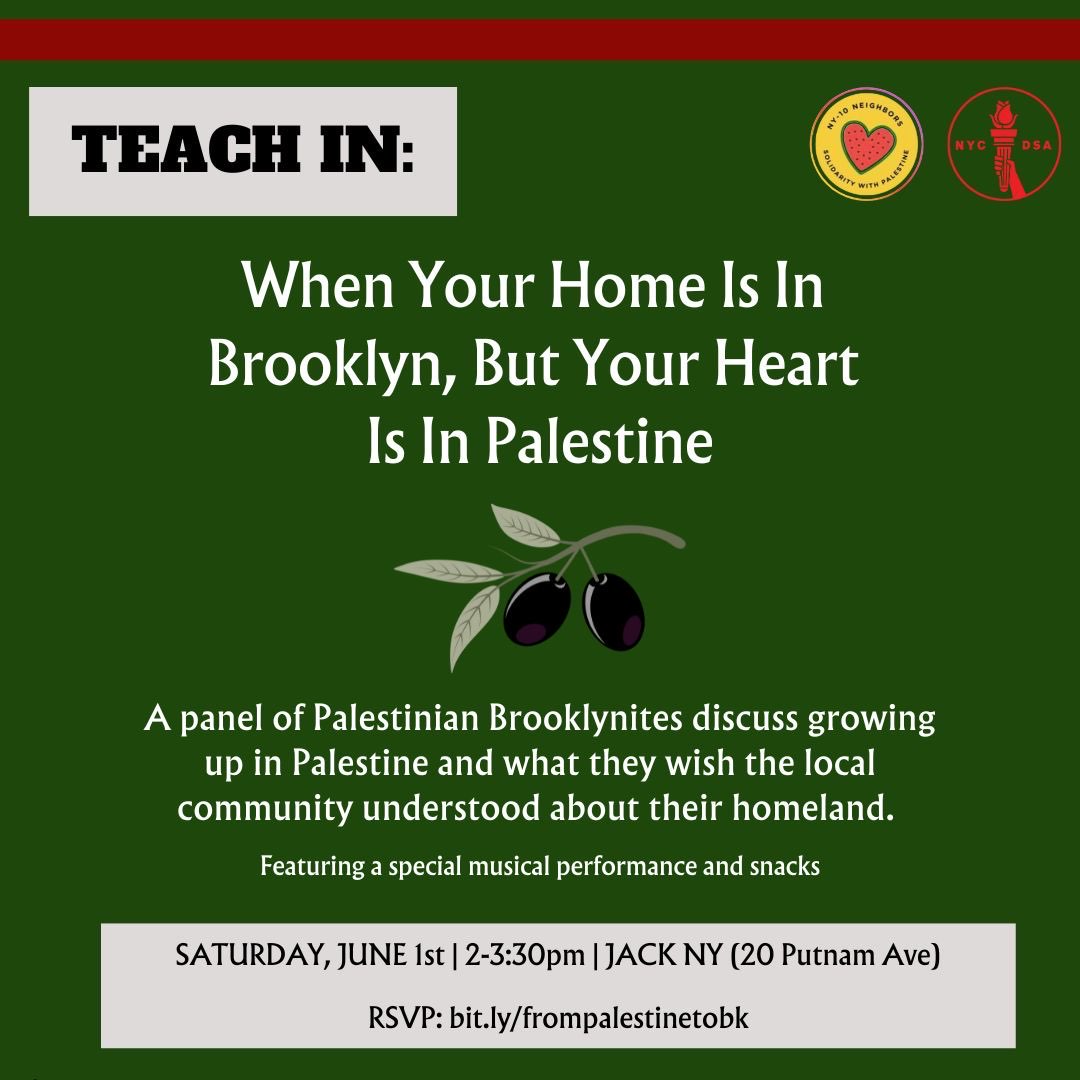 A conversation with Palestinian Park Slope residents on growing up in Palestine and what they wish their Brooklyn community understood about their homeland. This event will feature Palestinian speakers, a musical performance and some Middle Eastern bites.