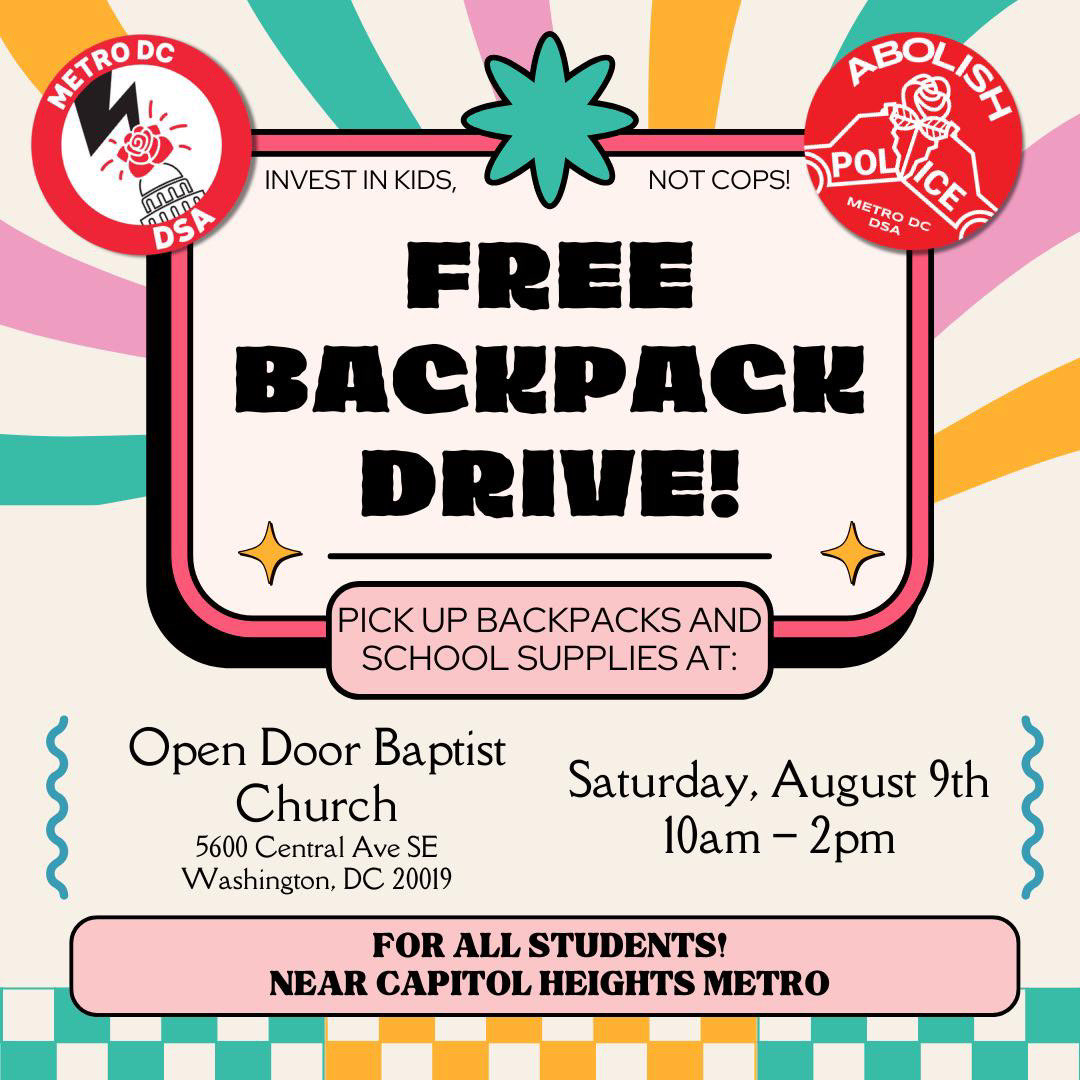 Metro DC DSA’s Abolition Working Group is hosting our 2nd Annual Free Backpack Distribution on Saturday, August 9th. We’ll distribute backpacks filled with school supplies to ALL students - no questions asked, no barriers. Your support will directly purchase backpacks and essential school supplies (notebooks, pencils, crayons, glue, etc.) for students in our community.