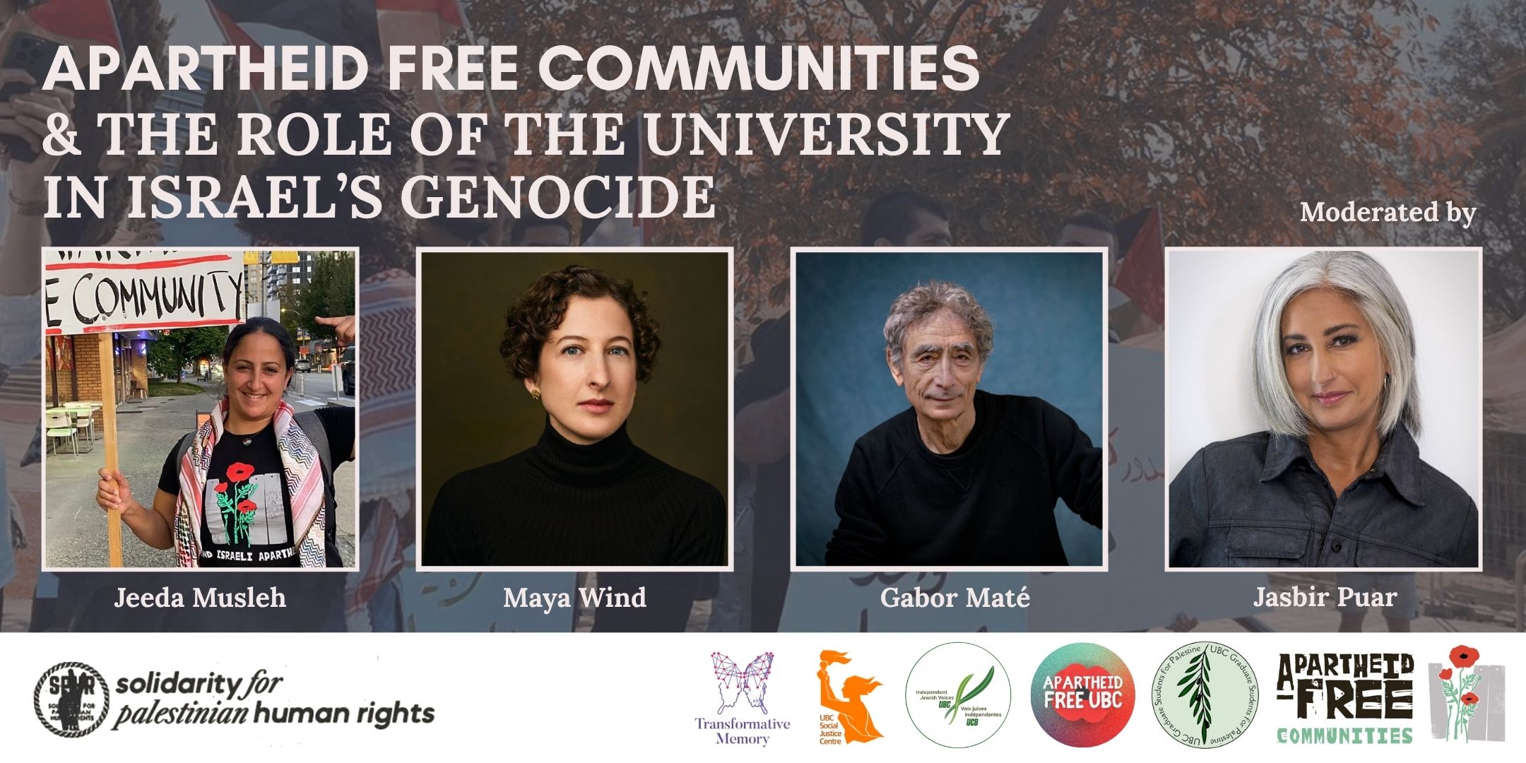 This event brings together author Gabor Maté; activist Jeeda Musleh from Apartheid Free Communities BC; and anthropologist Maya Wind in a panel moderated by activist and scholar Jasbir Puar that addresses how Israeli institutions sustain apartheid and systemic, racist violence against Palestinians.
