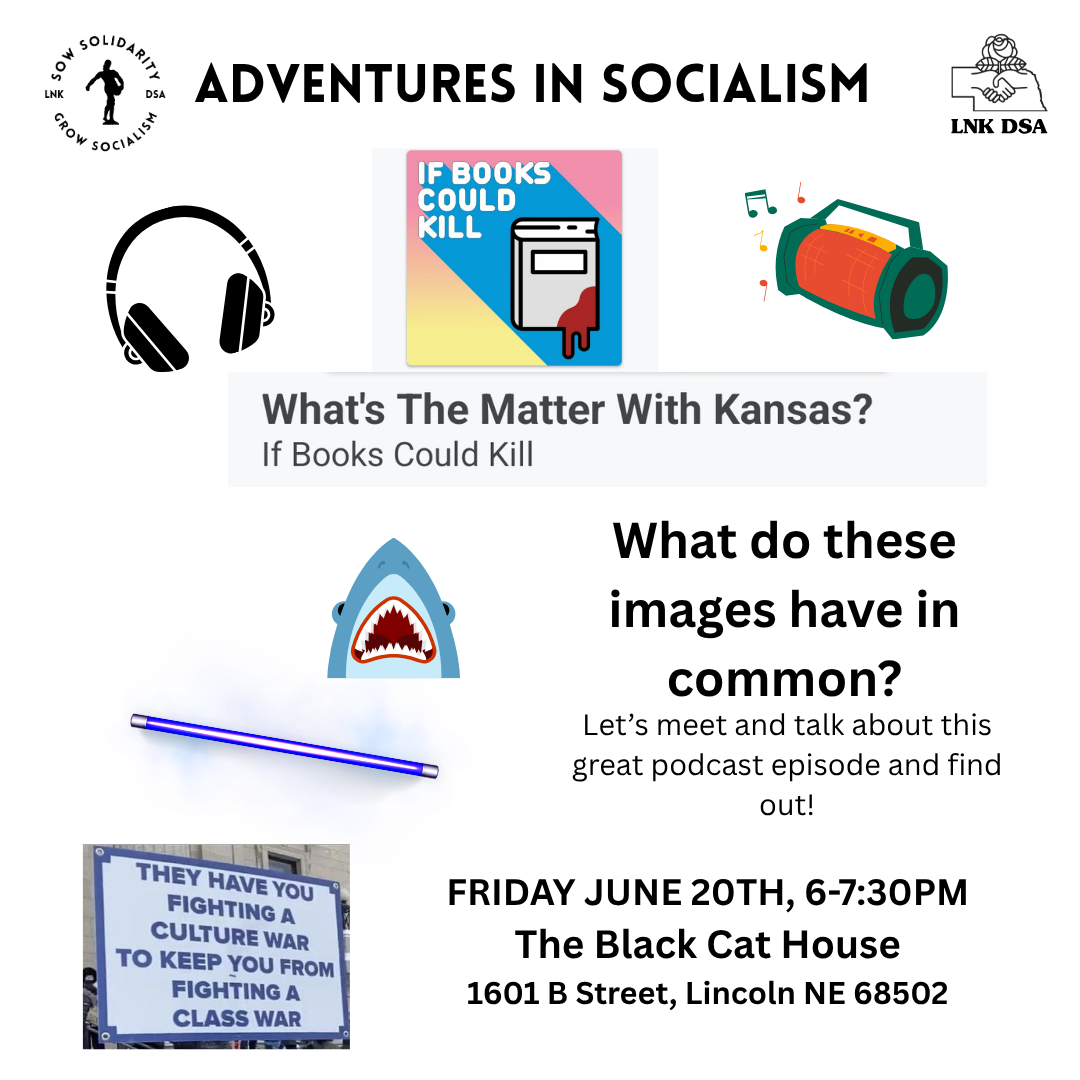 Adventures In Socialism: Lincoln DSA's Multimedia group is meeting for a do-over of the last session with our hosts The Black Cat House. The Black Cat House is an organization dedicated to educating ourselves and the community about oppressive power structures, and how to dismantle them. They have a great library of varying media and are an awesome organization to know, be apart of, and work with to better our communities. We will be discussing the last sessions topic "If Books Could Kill" podcast episode 'What's The Matter With Kansas?'.