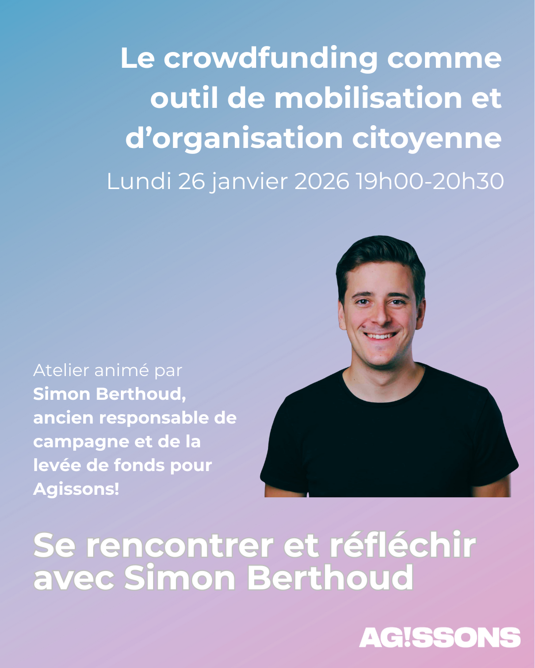 Cette soirée s’appuiera sur l’expérience du premier crowdfunding d’Agissons! en 2023, mené dans le cadre de sa campagne sur les droits politiques pour toutes et tous, qui avait réuni plus de 400 donateur·ices pour un total de 53’000 CHF. À partir de ce cas réel, nous prendrons le temps d’identifier ce qui a fonctionné, les difficultés rencontrées et les enseignements utiles pour réussir la prochaine étape.