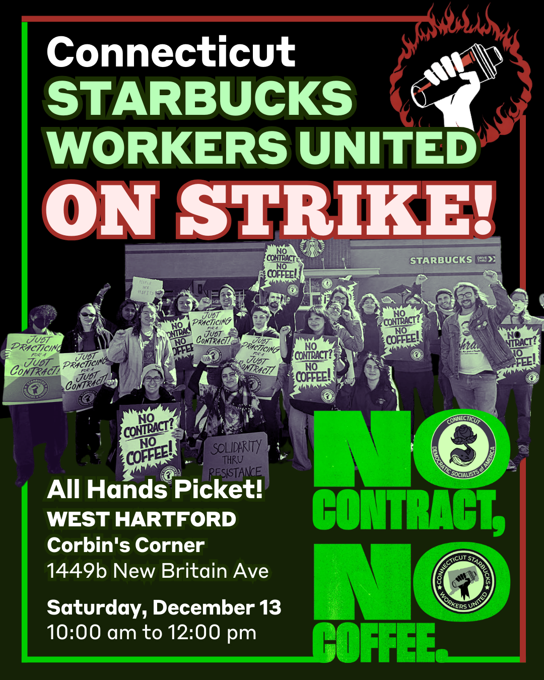 Join CT DSA for an all-hands picket line at the Corbin's Corner Starbucks, located at 1449b New Britain Ave, in support of Starbucks Workers United who are on a nationwide Unfair Labor Practices (ULP) strike this holiday season. No experience necessary, signs will be provided or feel free to make & bring your own.