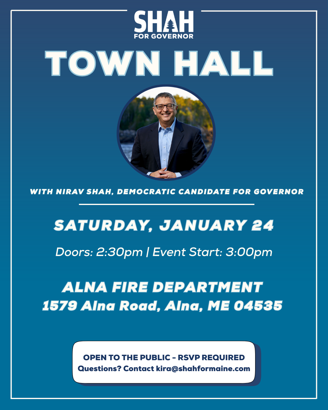 We’re excited to invite you to a Town Hall in Alna with Democratic gubernatorial candidate Nirav Shah.