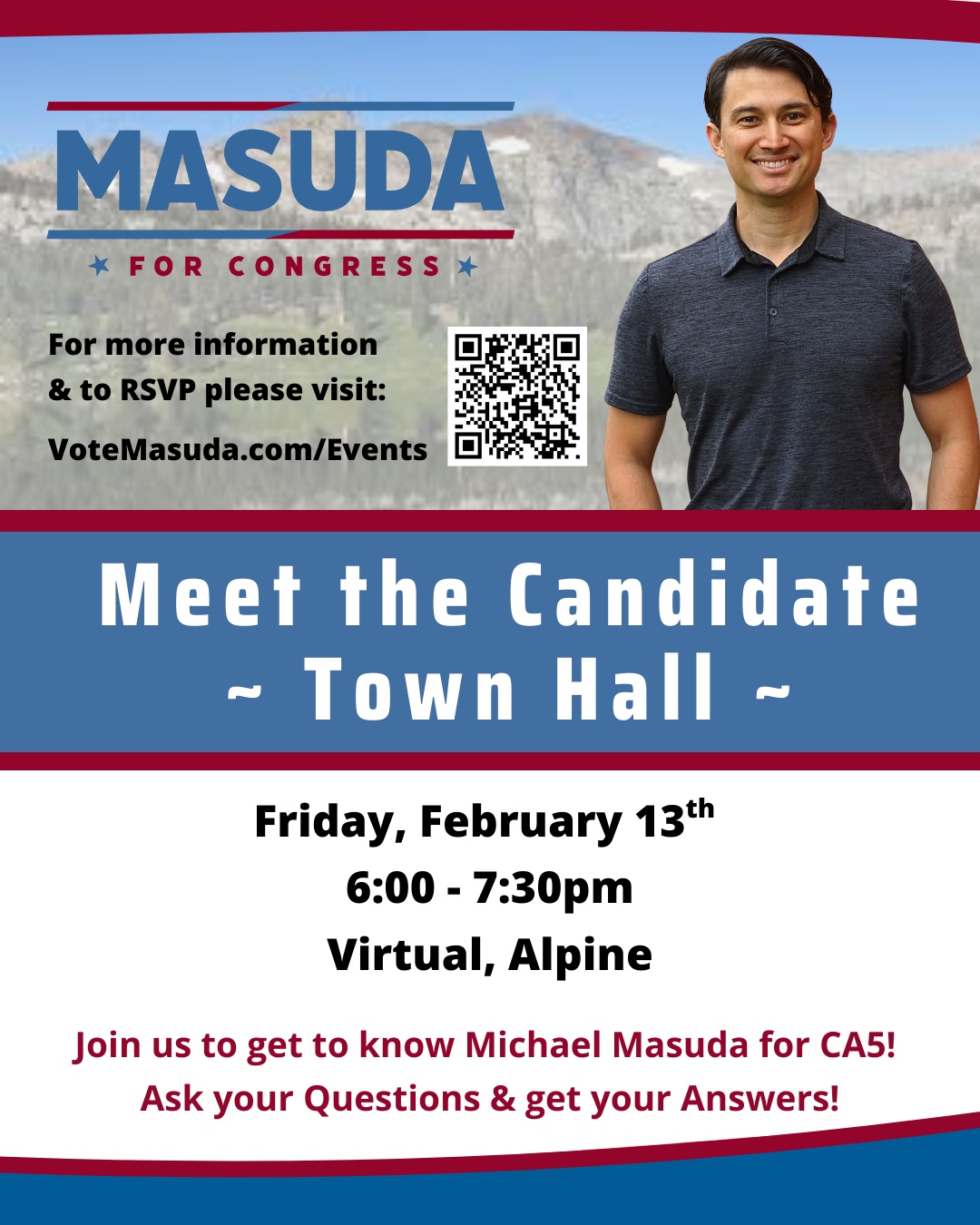 Masuda for Congress Meet the Candidate Alpine Virtual Town Hall on February 13th.