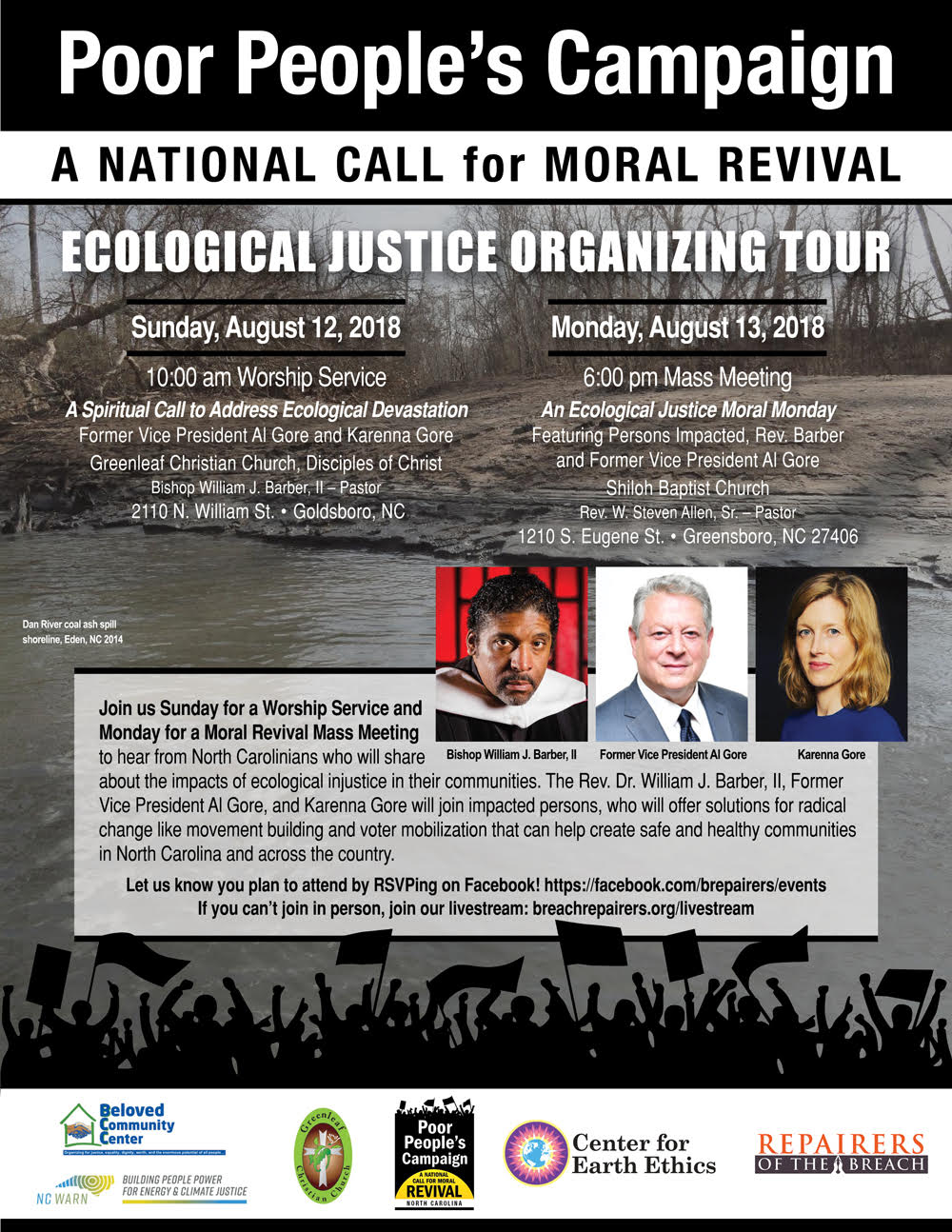 Join us Monday, August 13th at 6pm for An Ecological Justice Moral Monday to hear from North Carolinians who will share about the impacts of ecological injustice in their communities. The Rev. Dr. William J. Barber, II, Former Vice President Al Gore, and Karenna Gore will join impacted persons, who will offer solutions for radical change that can help create safe and healthy communities in North Carolina and across the country.