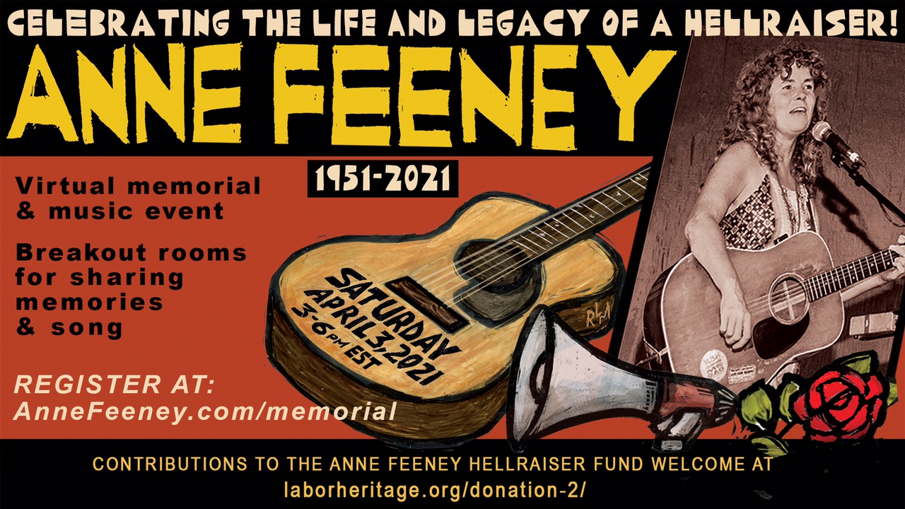 Please join us in celebrating the life of Anne Feeney on Saturday April 3, 2021 at 3 pm Eastern, 2 pm Central, 1 pm Mountain, 12 noon Pacific times.
