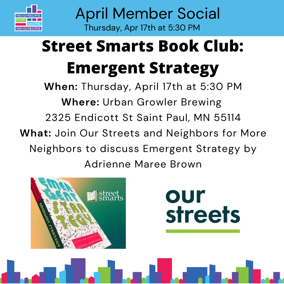 For the April N4MN's Member Social we will be joining the Street Smarts Book Club hosted by Our Streets at Urban Growler.