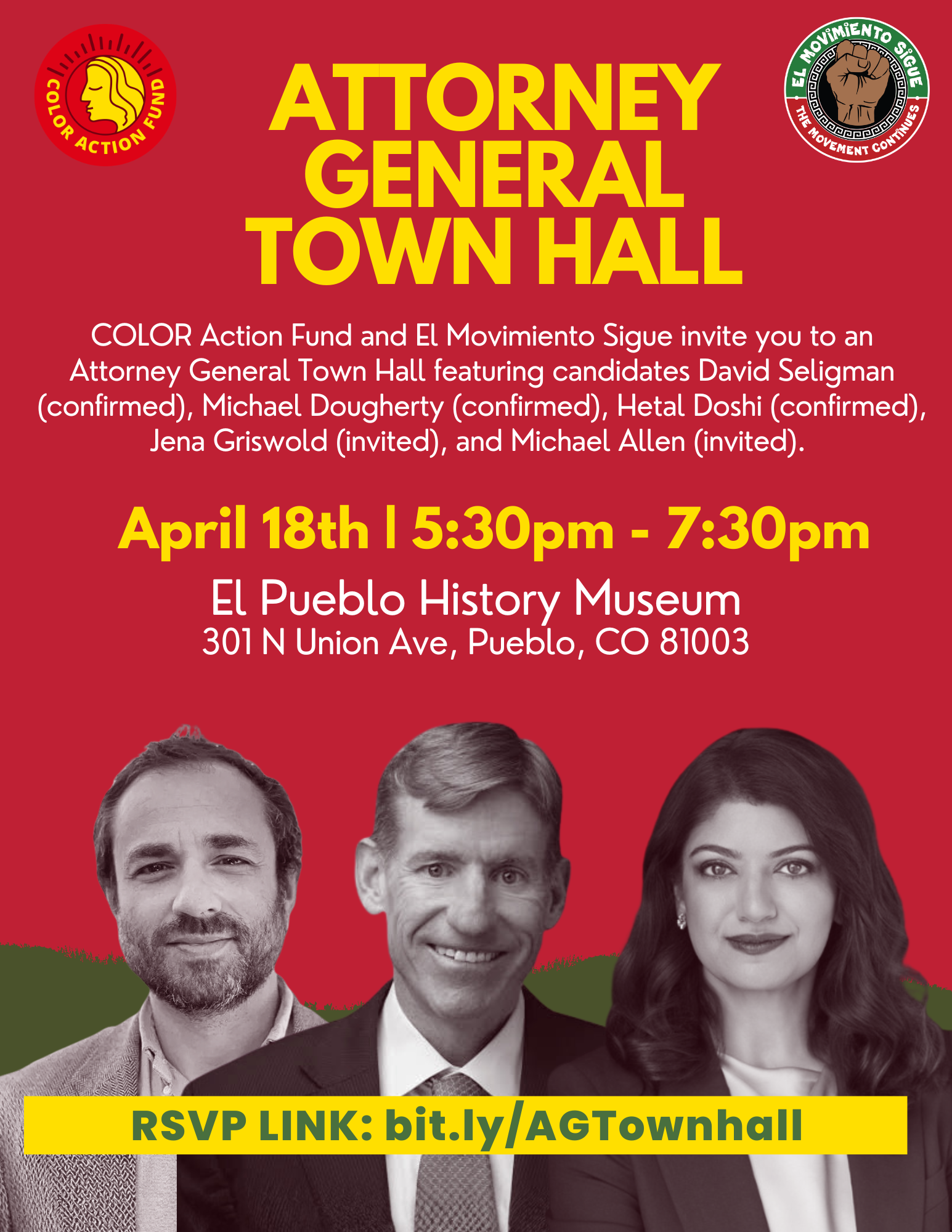 COLOR Action Fund and El Movimiento Sigue invite you to an Attorney General Town Hall featuring candidates David Seligman (confirmed), Michael Dougherty (confirmed), Hetal Doshi (confirmed), Jena Griswold (invited), and Michael Allen (invited).Saturday, April 18, 2026