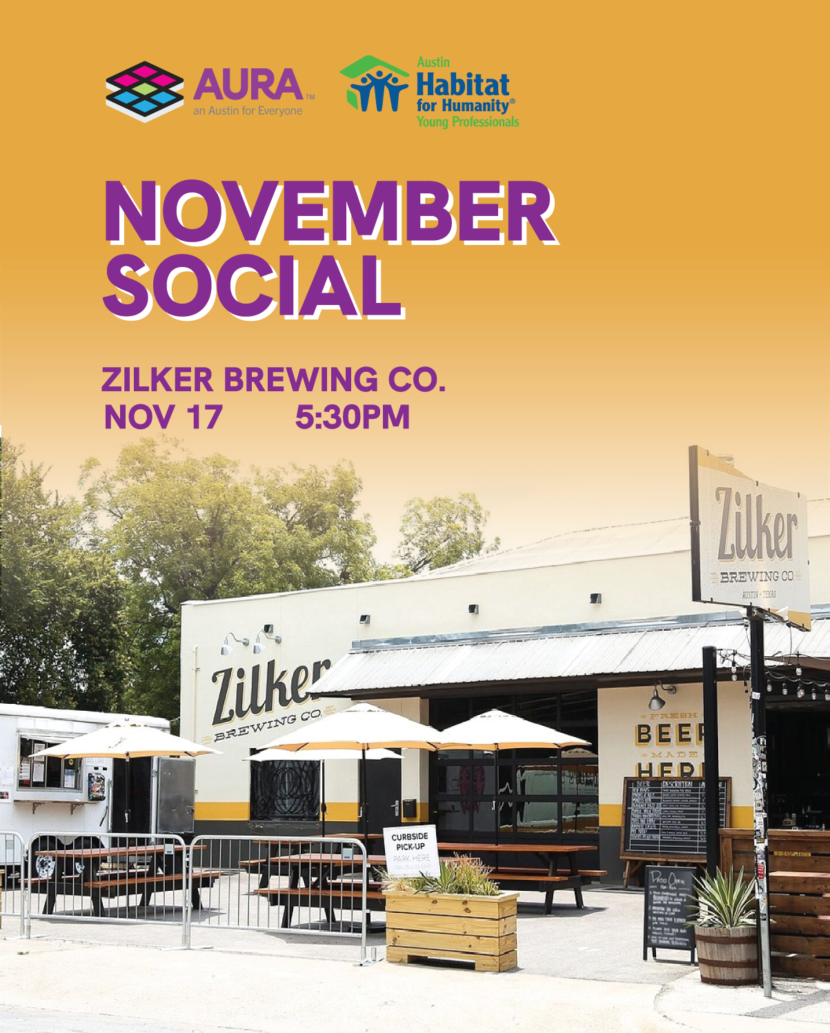 Join us for our November Social at Zilker Brewing on Monday, November 17. We’ll be there from 5:30pm until around 7:30pm, and we encourage you to invite your friends and family!