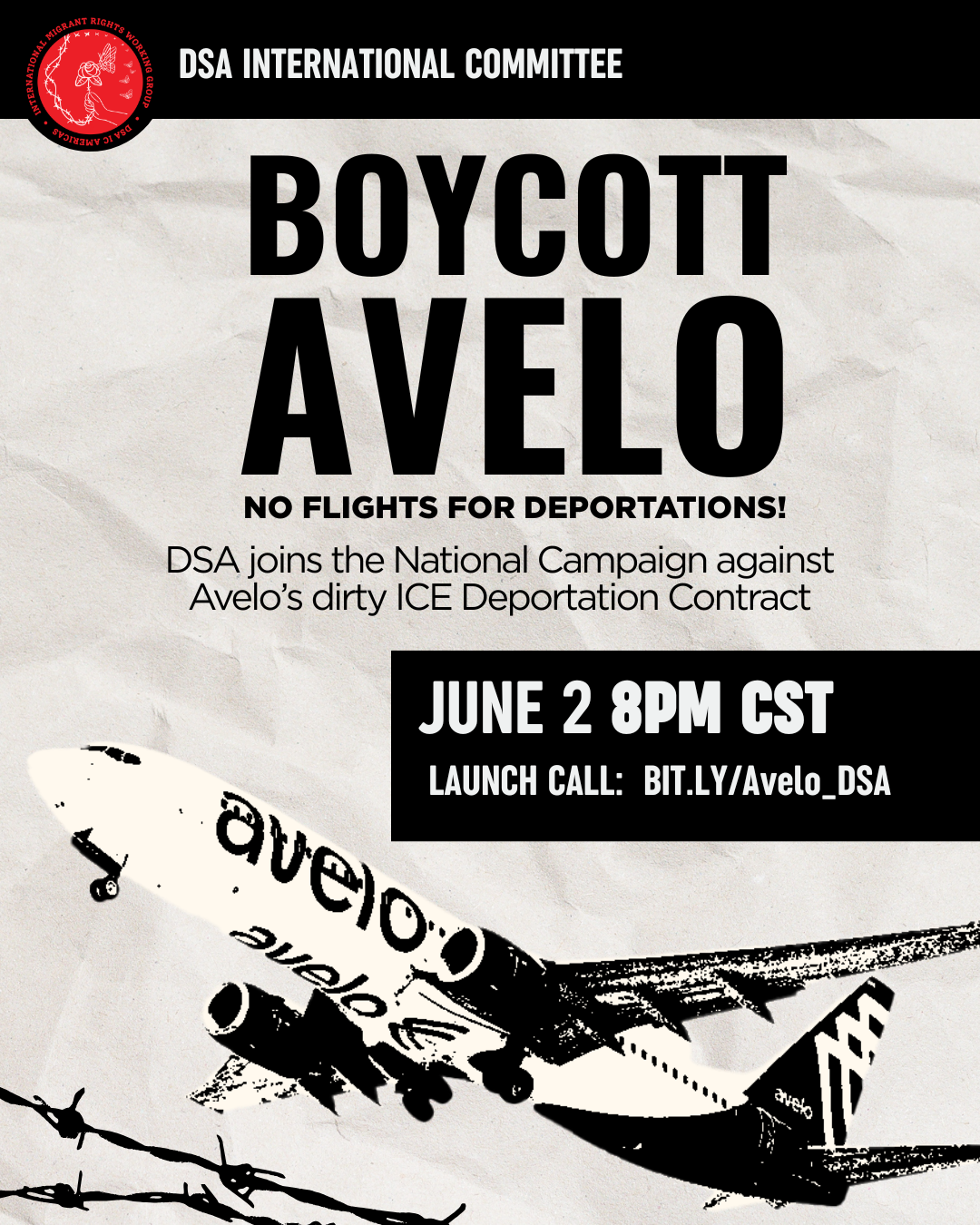 DSA has endorsed the national boycott and the International Migrant Rights Working Group is building a national coordinating structure for the over 35 DSA chapters with a presence in one of Avelo’s 55 destination cities.