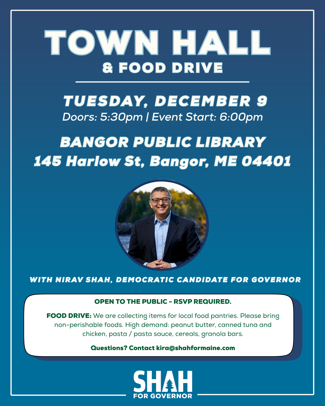 We’re excited to invite you to a Town Hall and Food Drive in Bangor with Democratic gubernatorial candidate Nirav Shah.