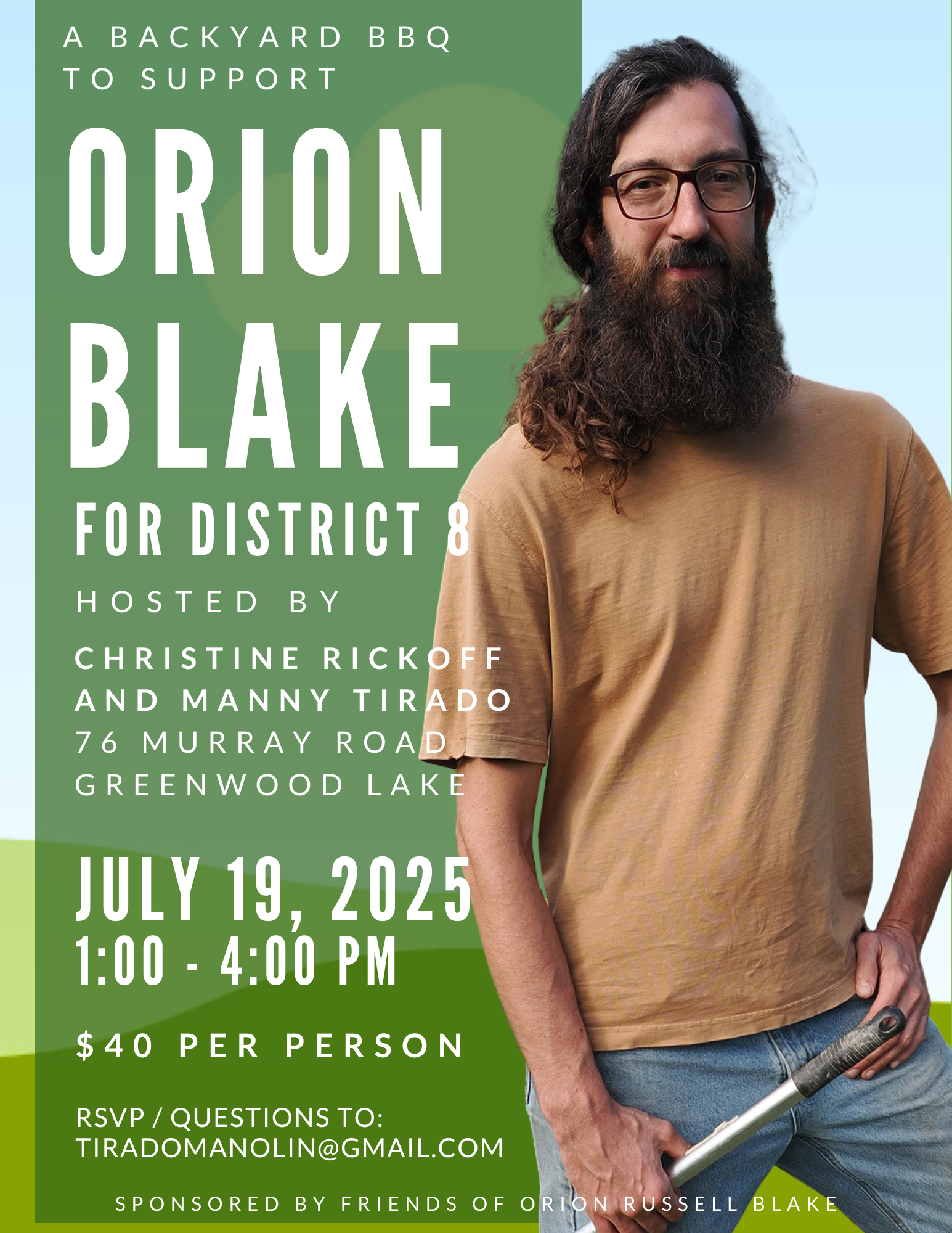 Orion Blake is running for Orange County Legislature in District 8. Orion is a local farmer, and his platform is laser-focused on protecting Warwick's farmlands, wetlands, and natural environment. Please join your fellow Democrats for an afternoon of food and fun to raise money for his campaign, hosted by Manny Tirado and Christine Rickoff.