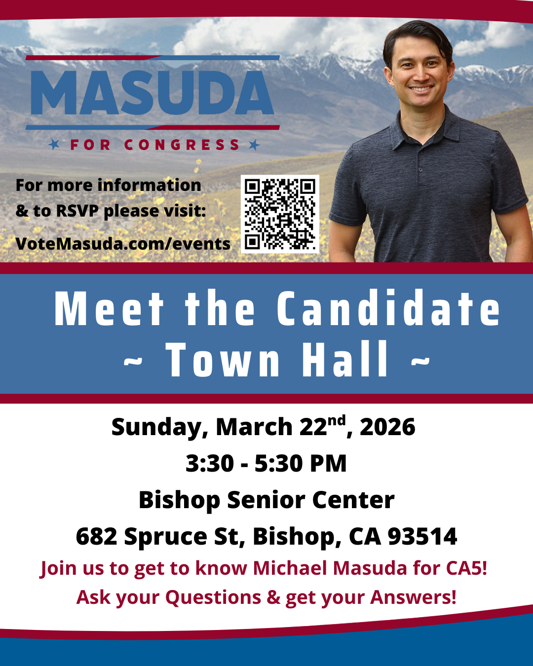 Masuda for Congress Meet the Candidate Town Hall in Bishop on March 22nd at the Bishop Senior Center at 682 Spruce Street, Bishop, CA 93514.