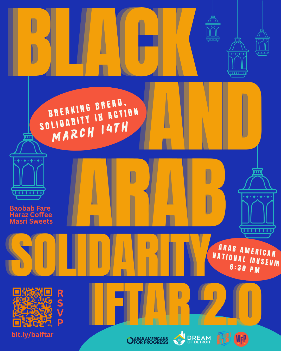 Join us for an evening of breaking bread, deepening relationships, and strengthening solidarity between Black and Arab communities in Detroit and Dearborn.