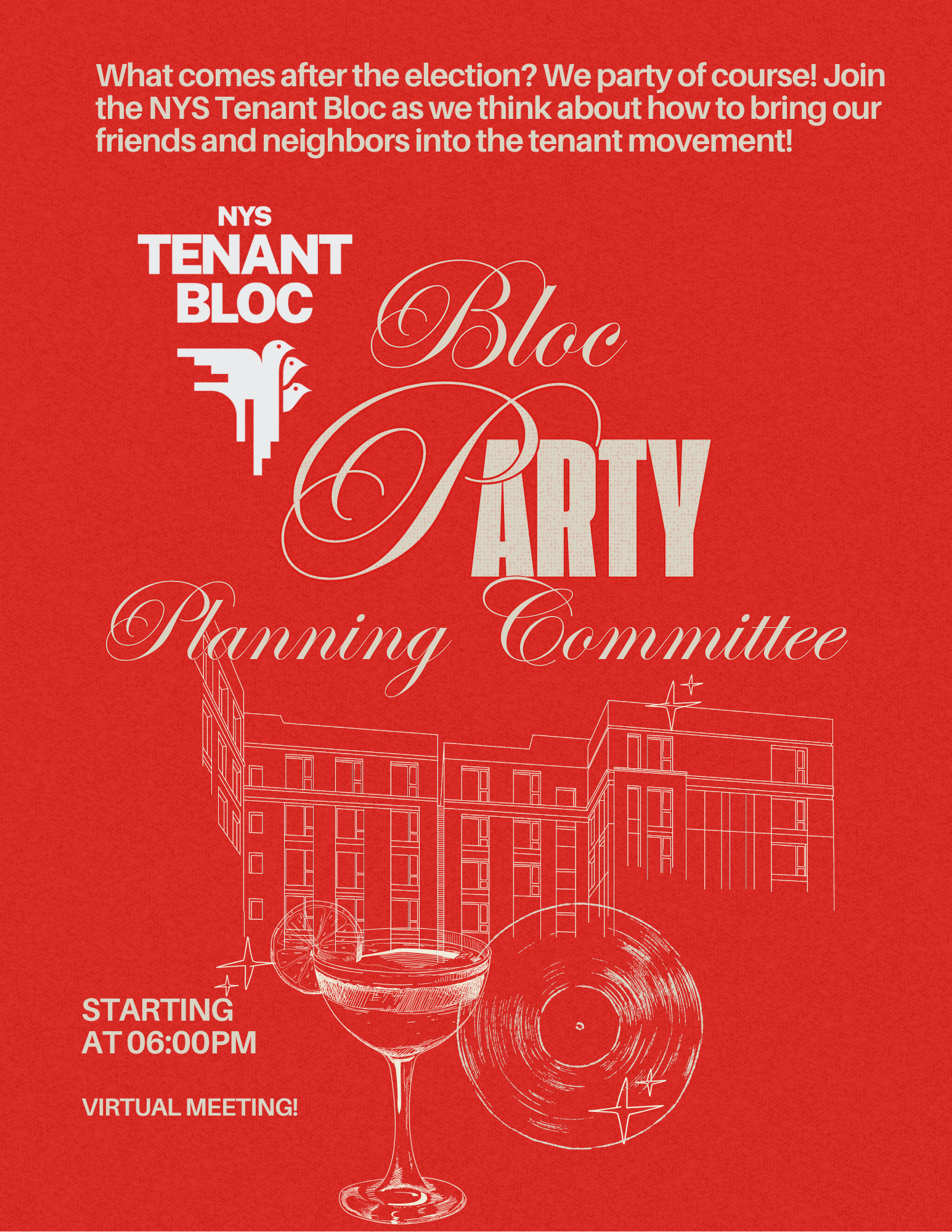 Join the NYS Tenant Bloc's Bloc Party committee, where we will be planning and hosting events to engage our friends family and neighbors into the tenant movement!