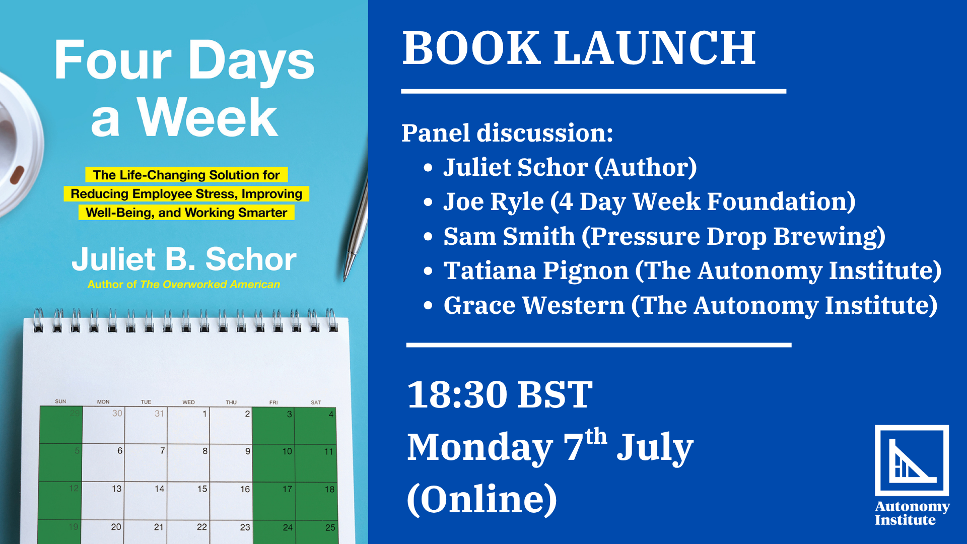 Join the Autonomy Institute for the online launch of 'Four Days a Week: The Life-Changing Solution for Reducing Employee Stress, Improving Well-Being, and Working Smarter' by Juliet Schor, a groundbreaking study of global interest in shorter working hours – and a blueprint for change.
