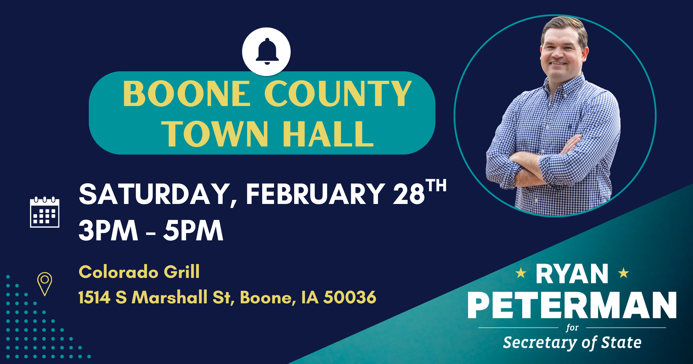Come meet Iowa Secretary of State candidate Ryan Peterman in Boone as part of his town hall tour! Ryan is a former Navy helicopter pilot running for Secretary of State to protect our right to vote, strengthen our small businesses, and restore honor and integrity to the office.