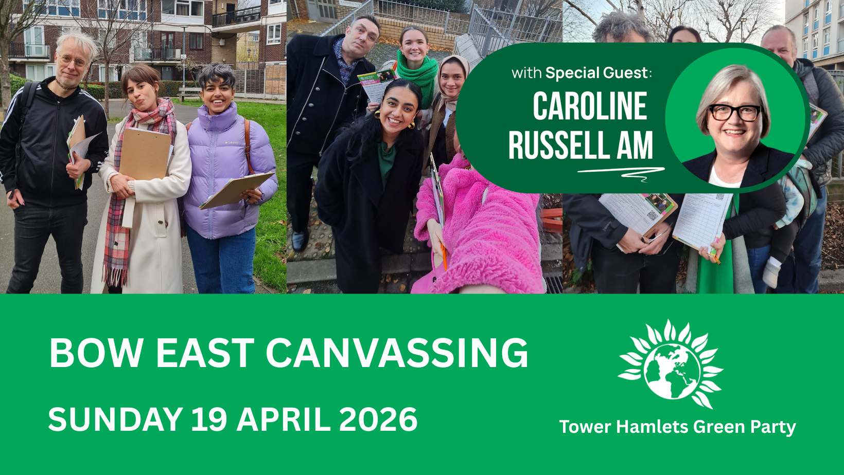 🍃 We're delighted that the London Young Greens and a special guest, Caroline Russell (leader of the City Hall Greens) will be joining us for canvassing and leafletting in Bow East on Sunday 19 April!