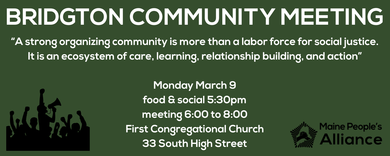 Join MPA members from the Bridgton area as we work to take action in our community and move MPA's work forward in our local community. This is an opportunity to connect with neighbors and build relationships with those passionate about social action. Dinner is provided, and please RSVP!