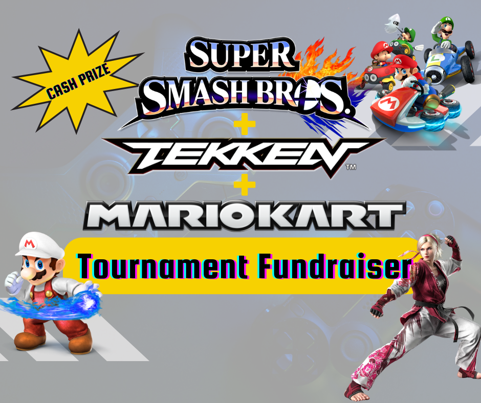 Get your game on Saturday, July 19th @ 7pm for a tournament-style fundraiser of Mario Kart 8, Super Smash Bros. Ultimate, and Tekken 8!