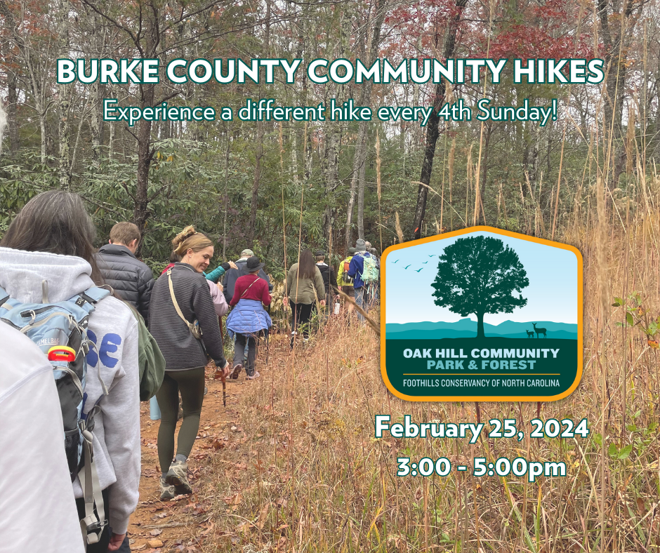 On February 25th join Foothills Conservancy of NC staff on a guided hike through Oak Hill Community Park and Forest! We will hike to the highest point in the park that showcases a view of the South Mountains. Plan to meet up afterwards at Brown Mountain Bottleworks for a celebratory drink!