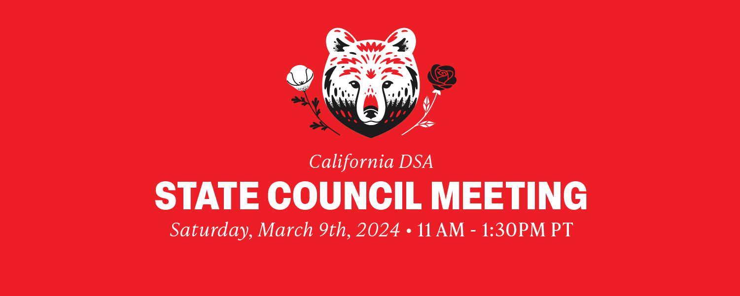 Join California DSA's State Council for our March 2024 deliberative meeting. All DSA members in good standing are welcome to join this meeting, though voting and debate will be reserved for elected delegates. The meeting will feature several California chapters, reports from CA-DSA's State Committee and its issue committees, and deliberation on several key business items.