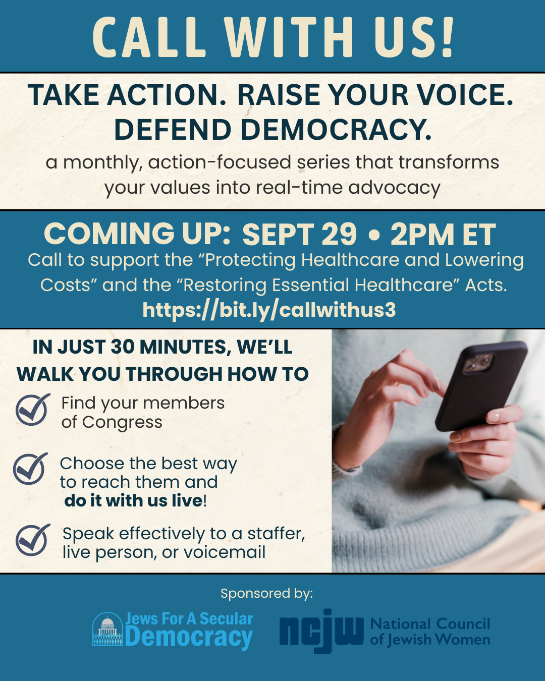 Join Call With Us!, our monthly action-focused series that helps you turn your values into real-time advocacy. In just 30 minutes, we’ll guide you step by step as you contact your federal legislators about urgent issues affecting democracy, equality, and religious freedom.