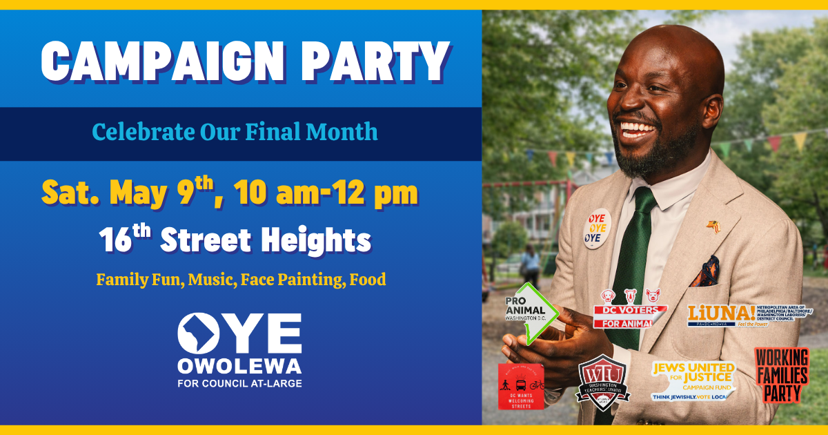 Join us in 16th Street Heights for a joyful community campaign party with Dr. Oye Owolewa!