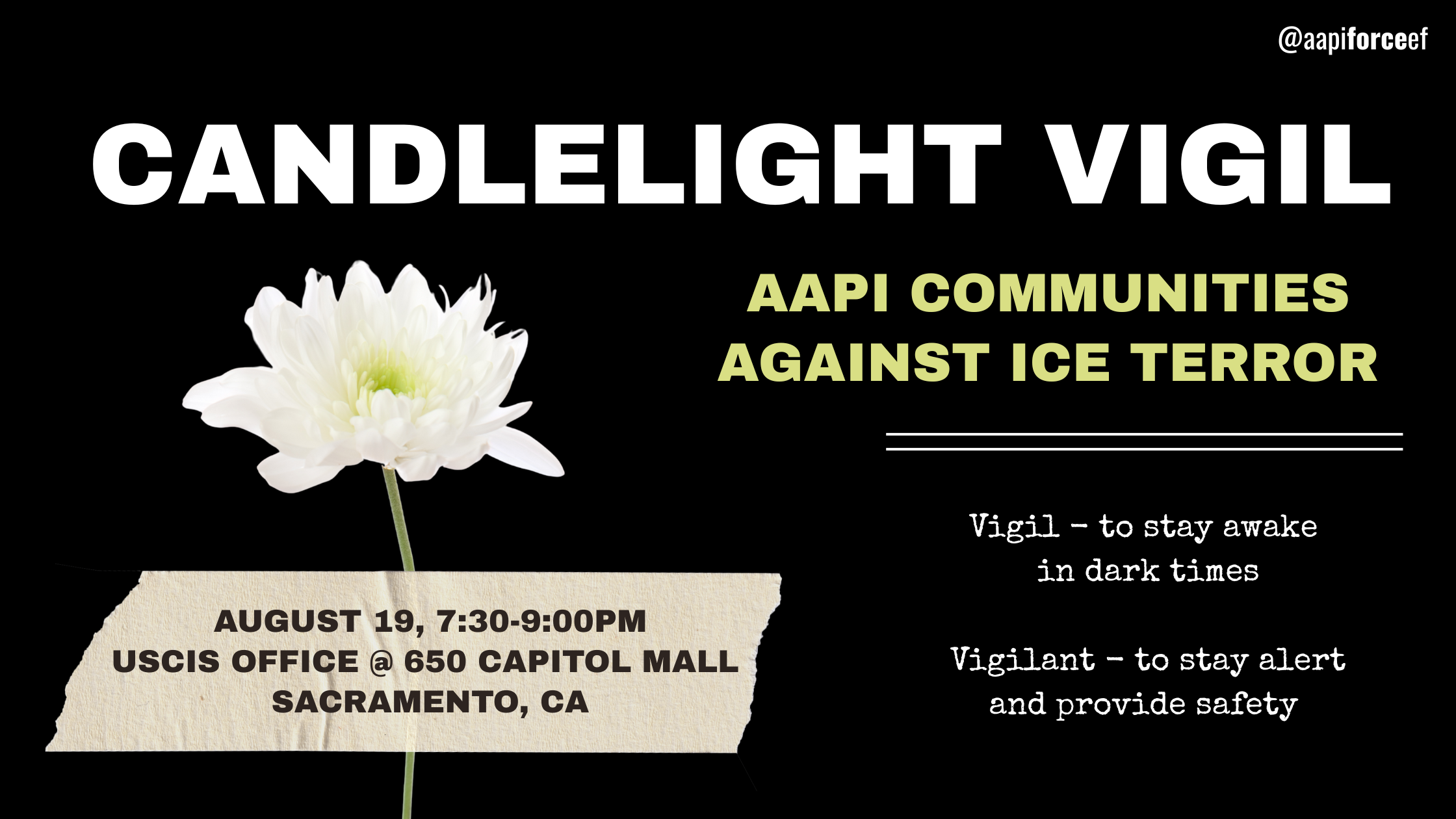 On Tuesday, August 19, AAPI FORCE-EF will host a candlelight vigil outside the US Citizen and Immigration Services Sacramento Field Office to bring attention to ICE terror against Asian American immigrant and refugee communities.
